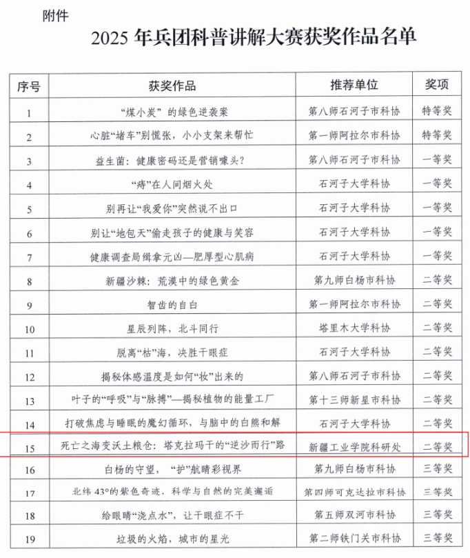 近日,兵团科学技术协会公布了2025年兵团科普讲解大赛的获奖名单。作为一所新建高校,我校首次组织参与该项兵团级科普赛事,凭借扎实的内容设计与创新的展示形式,成功斩获一项二等奖及两项优秀奖,实现了学校在兵团级科普赛事中获奖“零的突破”,为我校科普工作持续发展奠定了良好基础。